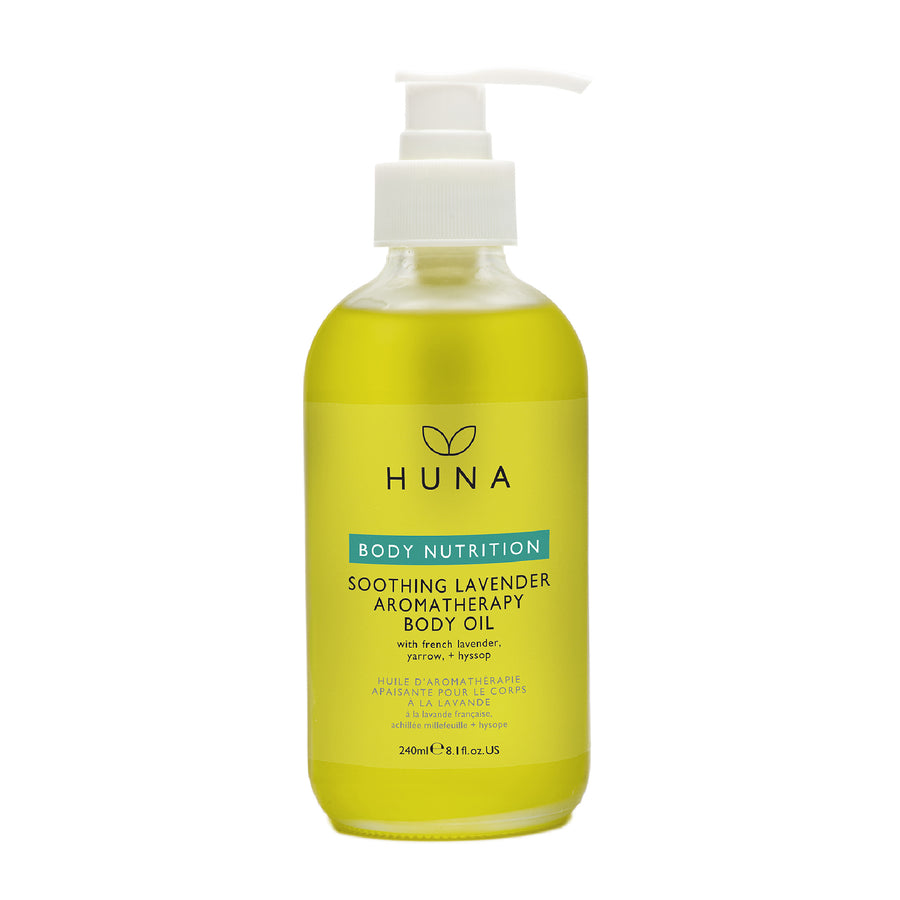 This Aromatherapeutic Body Oil is a staple in evening self-care routines. Feeling frazzled? Trouble relaxing? Can’t sleep? Huna's recommendation is to add few pumps to running bath water, mix water well and enjoy a long, hot, soothing therapeutic soak. Follow by smoothing a few pumps of Soothing Lavender Aromatherapeutic Body Oil over the entire body using circular massage starting from the feet and working up to the neck. Giving yourself a loving self-care lymphatic massage feels so incredible, be sure to take deep slow breaths to fully experience the calming benefits of the aromatherapy taking effect.